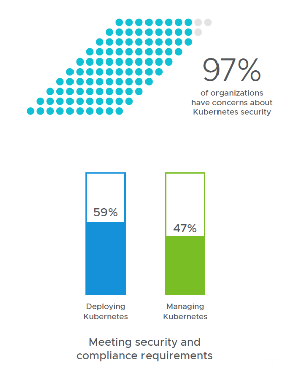 VMware最近的一项研究1显示,97%的企业存在Kubernetes安全问题(图-1)。满足安全与合规要求已成为部署(59%的受访者)和管理(47%的受访者)Kubernetes的头号挑战。缺乏对Kubernetes最佳实践的了解以及由此产生的错误配置会给云原生应用安全带来巨大的威胁。
