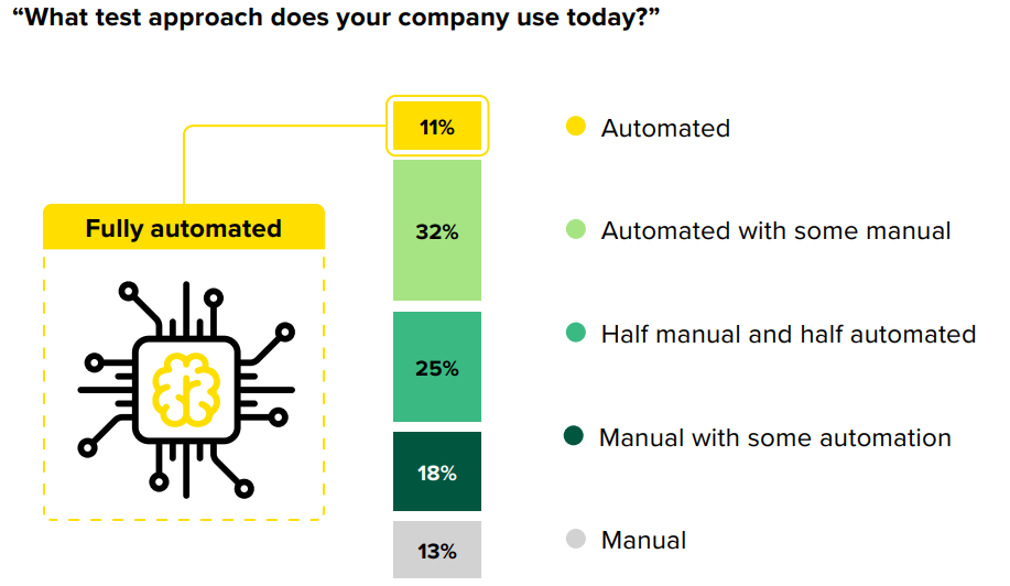 这份研究报告名为《借助自动化和人工智能(AI)征服复杂的测试》,该报告指出,自动化测试已取得一定的进展,75% 的组织采用了自动化测试和手动测试相结合的方式。然而,只有 11% 实现了完全自动化。随着复杂性不断增加,测试项目也在增加(77%),如果不采用自动化方式,产品开发速度就会受到影响。