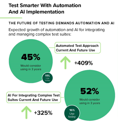 然而,企业也认识到,手动和部分自动化的测试方法无法应对日益提升的产品复杂度。因此,45% 的受访者考虑会在未来三年内采用全自动方法,增幅为 409%。超过一半(52%)的受访者表示,他们会考虑使用人工智能来整合复杂的测试套件,增幅为 325%。