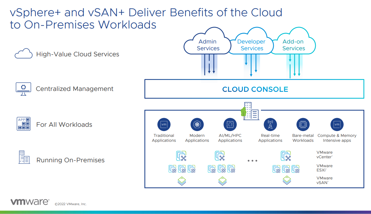 值得一提的是,除了现有平台功能,通过Project Arctic,同时借助VMware Cloud Console以及推新的vSphere+和vSAN+,客户则能够实现改变本地工作负载的运行方式,进而在vCenter中获得混合云的一系列服务及优势。