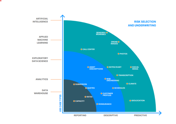 在承保过程中获得更多的数据后,就可以使用机器学习和人工智能来大幅提高工作效率。在此,同样建议保险公司采用循序渐进、随用随学的分步式方法提高工作能力。启用机器学习和人工智能,首先要通过高质量的报告来更好地了解被保险人的风险、敞口和展望;接下来则是进行探索性、描述性的分析;最终通过机器学习和人工智能优化事件预测,并在必要时采取预防措施,以实现积极主动的预测性分析。