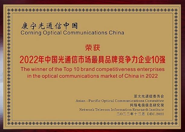 近日,在由亚太光通信委员会和网络电信信息研究院联合主办的《全球|中国光通信最具竞争力企业10强》评选活动中,康宁荣获《2022年全球光纤光缆最具竞争力企业10强》、《2022年中国光通信市场最具品牌竞争力企业10强》等荣誉。