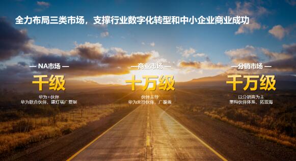 NA市场面向数以千计数字化进入深水区的大型企业,需要创新的解决方案;商业市场面向数十万希望借鉴先行者经验的中小型企业,帮助他们加速数字化;分销市场面向千万级的企业市场,满足那些规模小、标准化的场景数字化需求。