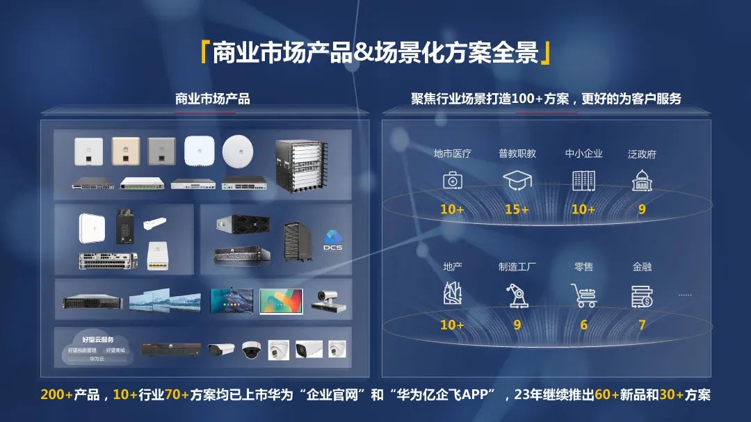 华为在商业市场持续推出新产品和方案,过去一年已上市200多款产品和70多个场景化解决方案。今年华为在商业市场面向教育、医疗、制造、中小企业、地产零售等重点行业将推出30多个场景化解决方案和60多款新产品。