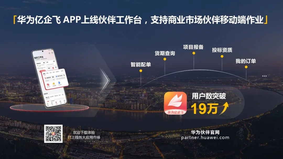 去年伙伴大会上,华为亿企飞APP发布。经过一年的迭代和推广,目前,APP已经积累了19万用户数。为了支撑伙伴更高效的进行业务拓展和移动端作业,今年一月,我们上线了“伙伴工作台”板块。伙伴工作台已陆续上线智能配单、货期查询、投标资质申请、项目报备、订单查询等功能。今年,华为亿企飞APP将持续迭代,让伙伴的作业更简单、更高效。