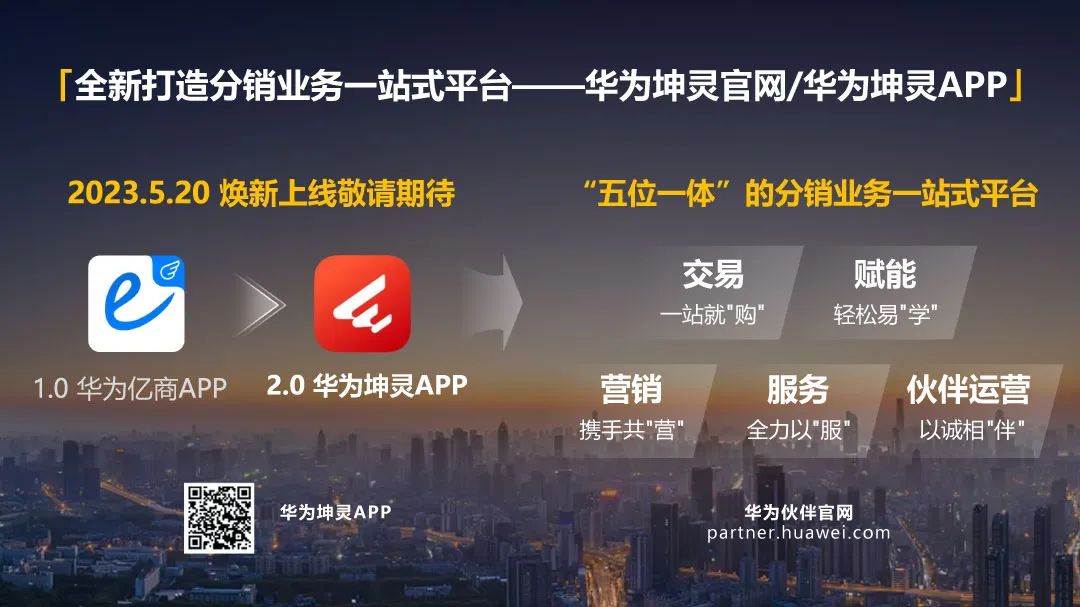 随着分销独立品牌“华为坤灵”的正式发布,华为亿商APP将在5月20日全新升级,正式更名为“华为坤灵APP”。华为坤灵APP将在现有能力的基础上,建设移动端的交易、赋能和伙伴运营等能力,欢迎大家持续关注。
