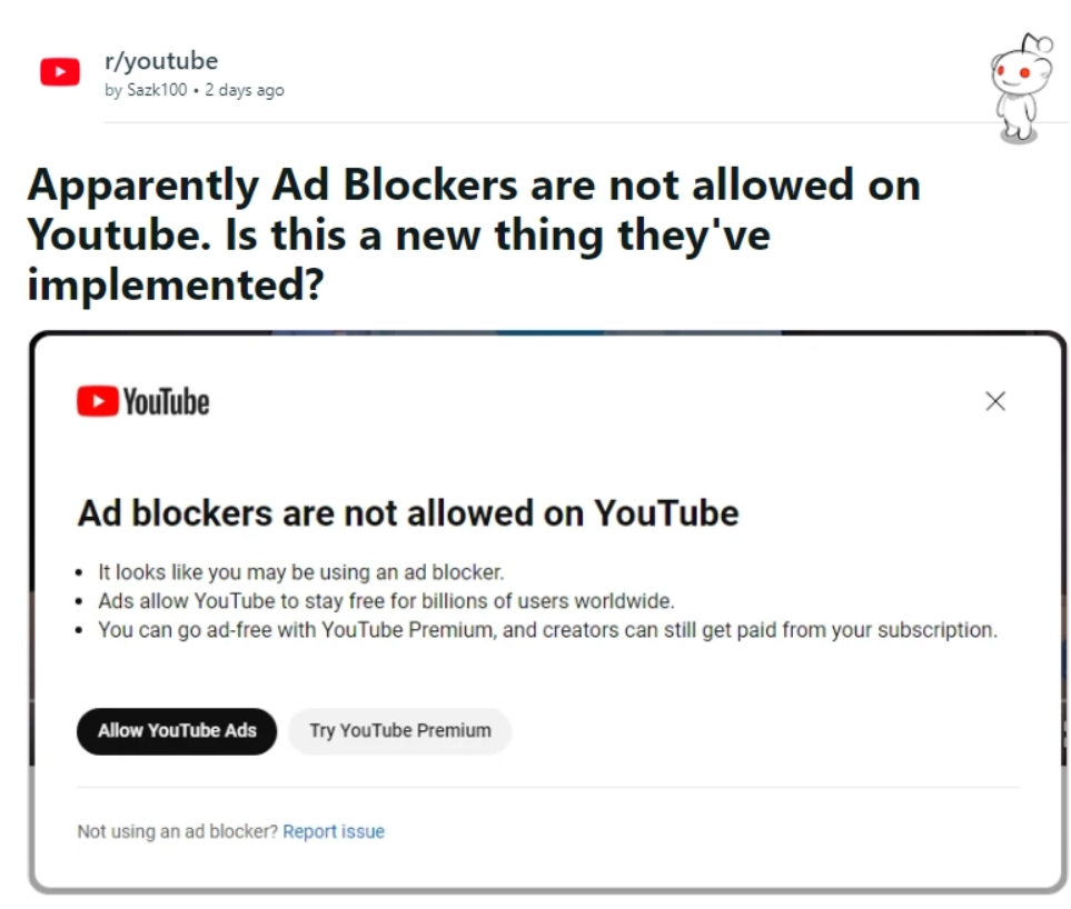 本周早些时候,一位 Redditor 用户首次发现,在尝试使用 YouTube.com 时,出现了一个弹出窗口,提示 YouTube 上不允许使用广告拦截器。视频将被禁止串流播放,除非用户随后允许 YouTube 广告或注册 YouTube Premium,后者是一种允许用户在没有广告的情况下观看 YouTube 内容的订阅服务。