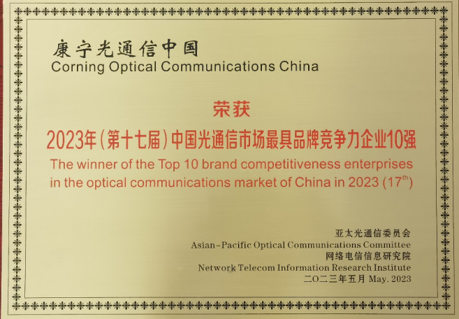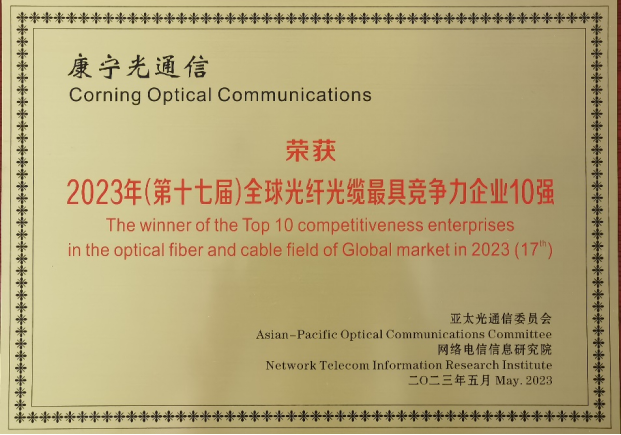 康宁荣获2023年全球光纤光缆大会最具竞争力10强奖项