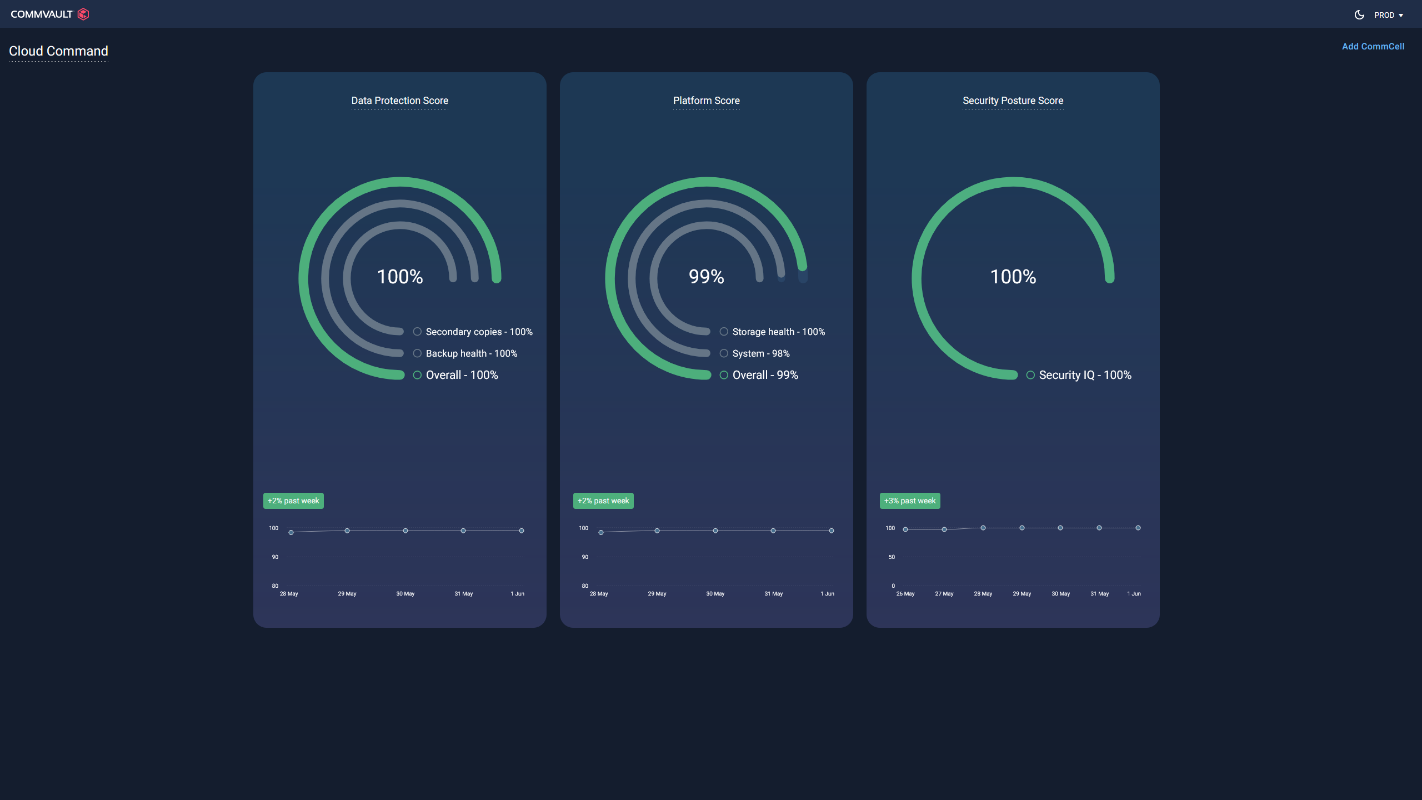• Commvault Cloud Command:该功能通过一个集成仪表盘,以单个平台和用户界面为所有Commvault产品组合提供通用管理。该仪表盘还支持用户对关键Commvault软件指标进行全面遥测和观察。该功能可以一站式地提供用户的Commvault资产健康状况、风险等级、安全和恢复指标等信息。