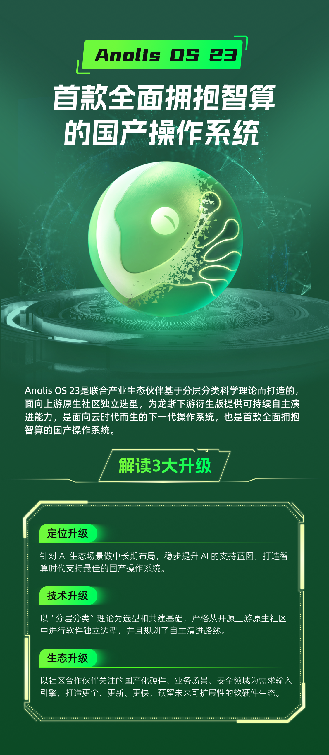 数字化、智能化技术不断推进与演变,用户对服务器操作系统提出新诉求,Anolis OS 23 立足云计算场景,打造智算时代领先的操作系统产品和解决方案,实现了定位升级,拓展了智能化服务的广度和深度,打造支持 AI 最佳的国产操作系统。面向满足国内自主需求以及整个技术体系的发展需求,Anolis OS 23 以“分层分类”理论为选型和共建基础,实现了技术升级,严格从开源上游原生社区中进行软件独立选型,核心组件自研发自维护,拥有可持续自主演进能力。
