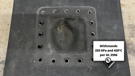 根据UL 2596《电池外壳材料热性能和机械性能测试方法》,采用热失控箱测试法完成了一系列测试,STAMAX 30YH570承受了250 kPa的箱内压力和420°C的最高箱内温度(封闭环境),测试面板没有破裂或穿孔。这些结果基于3次重复测试,面板厚度为4毫米。