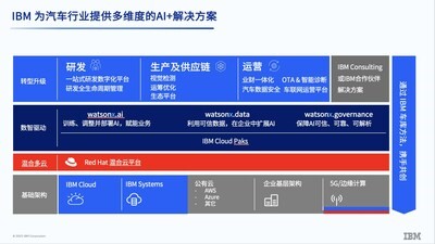 往上一层,IBM watsonx作为专门为企业打造的数据和人工智能平台,可以大幅提升 AI 在汽车企业中的应用。再往上,结合中国汽车行业的需求,我们从车企研发、生产和供应链以及运营的需求出发,设计了8个专属的解决方案、并引入IBM咨询团队的行业专长以及合作伙伴的加持,为车企提供端到端的"技术+咨询"的赋能。
