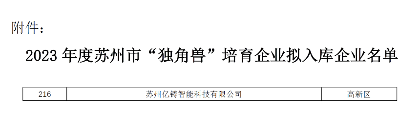 2024年1月4日 – 近日,苏州市科学技术局公布了2023年度苏州市“独角兽”培育企业拟入库企业名单并于1月2日结束公示,亿铸科技荣获市级“独角兽”培育企业资格认证。