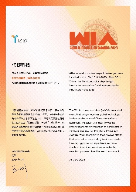 2024年1月15日 – 2024年1月10日-17日,中国科技领域最有影响力的大会之一,WIM 2023(World Innovators Meet,世界创新者年会)正式启幕。会上,亿欧联合“芯榜”发布《2023中国半导体芯片设计创新奖TOP10》榜单,亿铸科技荣誉登榜。