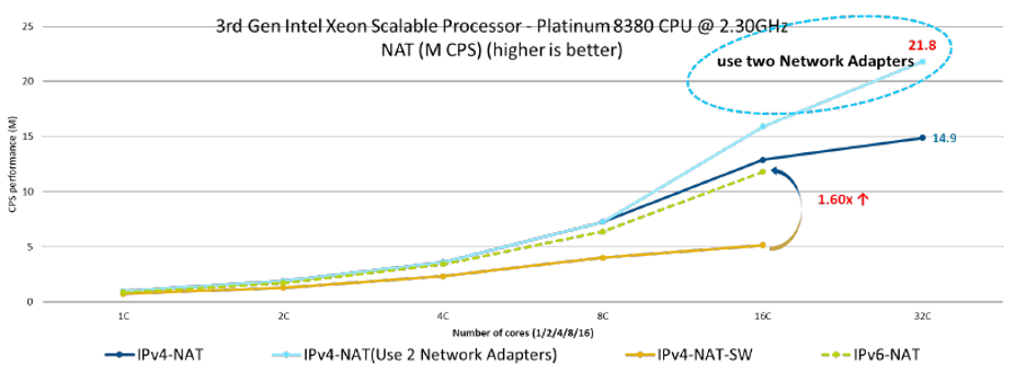 从测试结果可以看出,HDSLB在第三代英特尔至强处理器平台上TCP连接新建CPS最高可达21.8M,且CPS能够随CPU核数线性增长。更多测试细节请参考Intel 官方白皮书↓