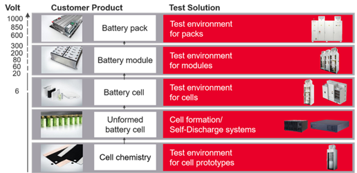 在设计和测试电池的过程中,如果电芯最终是组装成模块或者电池组为车辆供电,那么电池设计经理必须考虑如何兼顾不同应用的不同测试参数。电池的应用涵盖两轮摩托车、轿车、运动型多功能车和重型运输车辆。面向不同最终用户市场的电池需要满足不同的需求,需要采用不同的测试设置。因此,测试环境必须能够支持所需的电压、通道和安全要求(见图 4)。