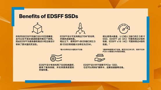EDSFF,即企业与数据中心标准外形规格,特点是由头部企业引领并获得行业认可,针对物理尺寸、散热、性能、布局、安装便捷性等特性优化,从而达到更好的效果。
