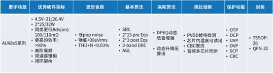 AU68x5系列产品是类比推出的首个带DSP的中功率数字功放,专门为高端电视、中功率音箱、高端投影仪的应用设计。