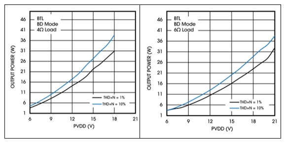 相比国际大厂同类功放,类比数字功放Rdson要小几十mΩ,有更大不失真功率和更高的效率(12V,1SPW,>90%)。对于音箱、soundbar产品,常见18V供电、4Ω负载下,1%失真可以达到2*30W的大功率输出,轻松满足常见的2*20W的功率输出要求。对于电视投影仪产品,常见的12V、6Ω负载下,1%失真能够输出2*11W,满足6Ω8W/10W的功率要求。