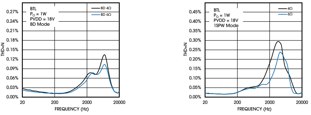 在全音频范围内(20Hz至20kHz),BD模式下的总谐波失真加噪声(THD+N)低于0.15%,这一性能达到了业界领先水平,充分展现了类比功放在音质保真方面的卓越表现。而1SPW模式在20~20kHZ测试下,THD+N也控制在0.3%以内,这一模式在保持高效率和低功耗的同时,依然维持了优异的失真性能,满足了市场对高端音频产品设计的严格要求。