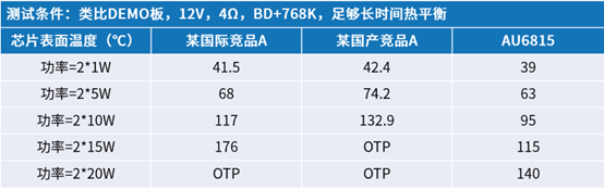 测试结果显示,在2*1W输出功率时,AU6815芯片的温度与市场上的竞争产品相当。然而,随着功率的提升,AU6815的优势逐渐显现。在2*10W输出时,AU6815的芯片表面温度显著低于竞品,分别低了22℃和37.9℃。当输出功率增至2*20W时,竞品芯片因温度过高触发了过温保护(OTP),而AU6815依然稳定运行。这表明,在相同功率条件下,AU6815的温升控制更为出色,从而为客户在设计时对PCB板层数、散热片规格以及铜皮厚度的选择提供了更大的灵活性和便利性。
