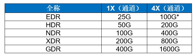 当前的InfiniBand交换机利用800G OSFP端口,采用下一代数据速率为400G(NDR)的双工端口。在该配置中,每个端口使用8根光纤,因而每台交换机使用64x400G端口。下一代交换机,无论其名称如何,将采用极限数据速率(XDR)。这意味着,每台交换机使用64x800G端口,每个端口也使用8根光纤——主要是单模光纤。该4通道(8光纤)模式似乎是InfiniBand路线图中反复出现的图示(如下表所示),而未来将使用更快的速度。