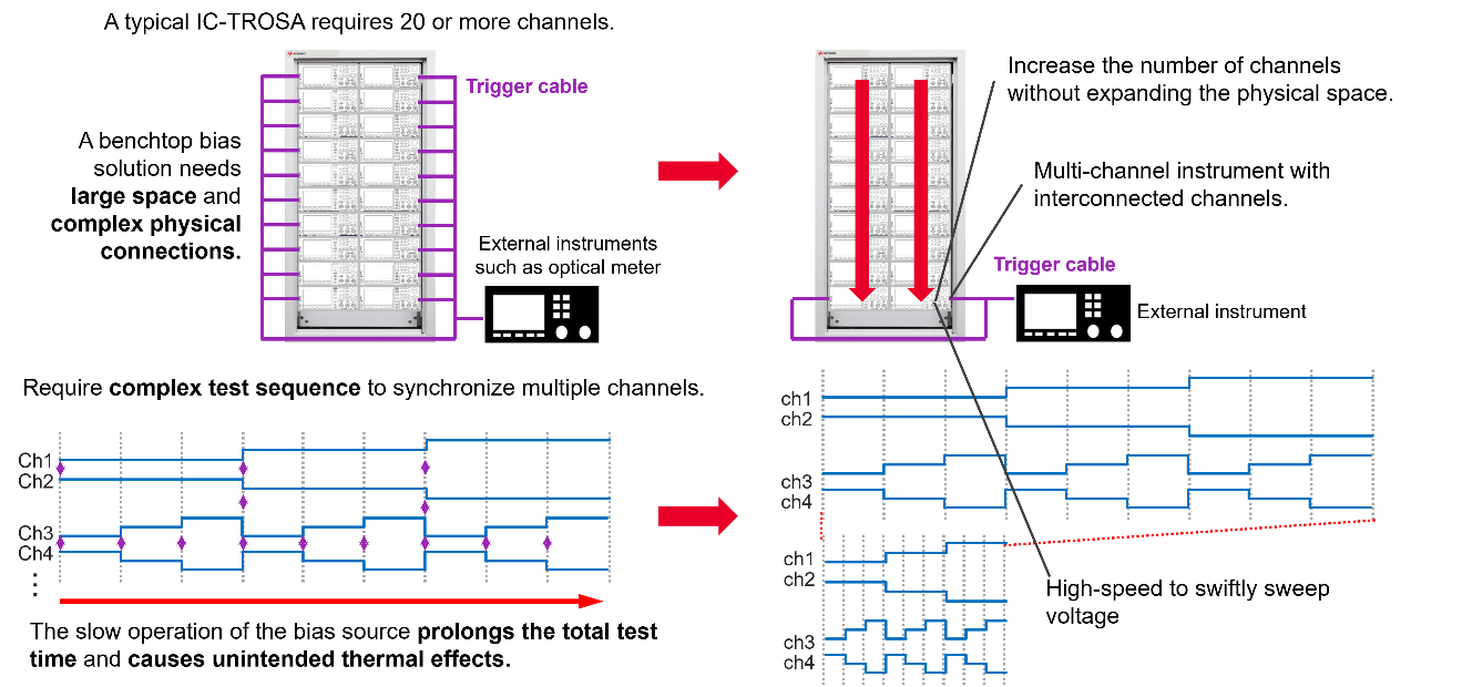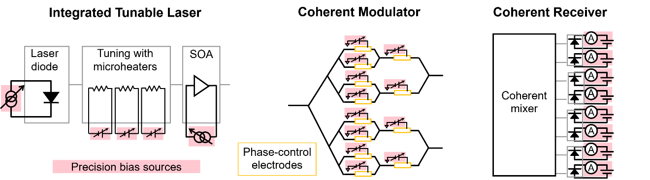通道密度越来越高:高度集成的光器件具有更多的测试端口和元器件,需要大量高精度电源和巨大的空间。例如,一体化可调谐激光源需要为激光二极管提供精密电流源,才能确保稳定的光性能,还需要为加热器提供高精度的偏置信号源,以便精准调节波长。相干光调制器也需要采用多个能够与相位控制电极精准同步的高精度偏置信号源,以便将电信号准确转换为光信号。