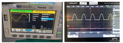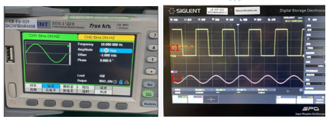 在该实验中,信号发生器产生具有1V偏置(Offset)、0.1V峰-峰值(Vpp)、10Hz频率(Freq)的两路信号,相位差为180°。两路信号的负端接入地线(GND),正端分别接入电流检测放大器的IN+和IN-(在-1V的共模电压上叠加0.1V正弦波,模拟两个反向电流)。