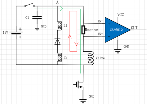 l 开关闭合时,电磁阀正常工作,节点A电压为12V,共模电压为12V。