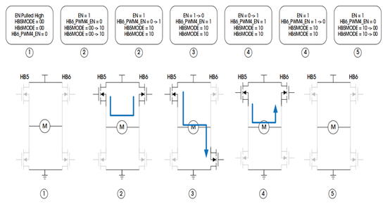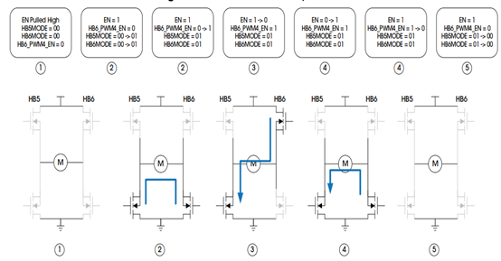 如下示意图,我们简单概述了PWM正向控制与反向控制的配置流程及信号流向。通过将EN_PWM4引脚映射至HB6,HB6内的HS和LS可根据HB6_MODE寄存器的设定转换为有源MOSFET,进而实现PWM驱动下的正向与反向操作。当HB6由EN_PWM4信号驱动时,外部MOSFET的充电与放电过程受到精细化管理,而这一过程的静态电流则由ST_ICHG寄存器中的HB6ICHGST位精准调控。