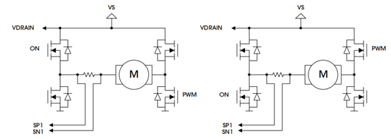 为避免PWM信号引起电流检测运放输入端的高共模电压摆动,建议将PWM信号应用于未连接分流电阻的半桥端。这一布局方式可有效减少信号干扰,确保电流检测的准确性与稳定性。如图8所示,展示了PWM与分流电阻在电机中的典型应用布局,直观地呈现了这一优化连接策略。