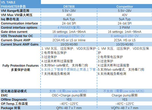 与国际竞品相比,DR7808不仅全面覆盖了基础功能,更在支持4路PWM信号输入、过流保护阈值的精细化调节、高低边驱动模式的智能切换、上下管握手逻辑的强化以及离线诊断与在线电流检测等多个方面进行了深度优化和增强。这些创新设计,不仅满足了客户对灵活设计应用的追求,同时也确保了系统运行的稳定性和安全性。
