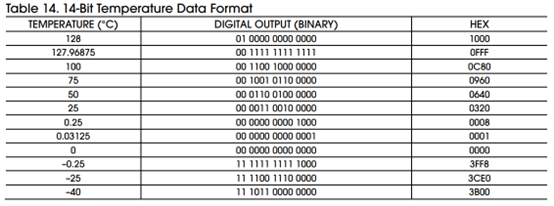 启用内置温度传感器模式,需将配置寄存器CONFIG REGISTER中的TS_MODE位设置为1。此时,温度数据将以16位转换结果中的14位左对齐格式表示,且从最高有效字节(MSB)开始输出。读取这两个数据字节时, 前14位用于表示温度测量结果。一个LSB 等于 0.03125°C。负数以二进制补码格式表示,如下表所示。