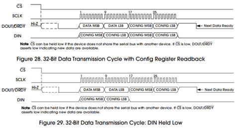 ADX112Q支持在单一数据传输周期内直接回读配置寄存器的设置。一个完整的数据传输周期由32位组成,当启用配置寄存器数据回读功能时;若CS线可控,且未设置为永久低电平,则周期为16位。在实际应用中,32位的数据传输周期更为常见。
