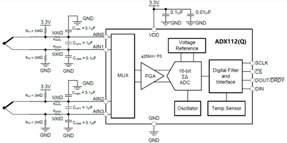 RC滤波器中的电阻选用了500欧姆,这一取值避免了与ADX112的输入阻抗形成不利的分压效应,防止对增益误差造成过大影响。若系统设计中已考虑对增益误差进行校准,则电阻的取值可以适当放宽。