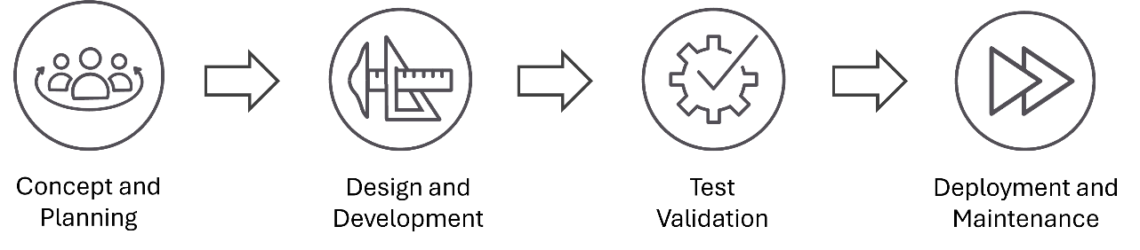 众所周知,产品开发生命周期有几个关键阶段。工程师会在各个阶段执行产品测试工作,以确保整个产品开发过程符合公司制定的业务计划和目标。随着时间的推移,大多数的产品开发流程会因为新市场需求的出现以及激烈的竞争等因素而变得越来越复杂。图 1 显示了产品开发生命周期的各个阶段。