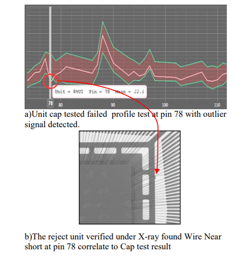 基于电容的测试技术成功应对了这两项挑战。这一先进技术能够检测到那些传统 ATE 和 X 射线系统难以察觉的缺陷,例如键合线和内部引线之间的 “近似短路 ”以及垂直方向上的导线下垂问题。此外,它还能识别出芯片错误和模塑化合物问题等其他方面的异常,进而显著提升了其诊断能力。