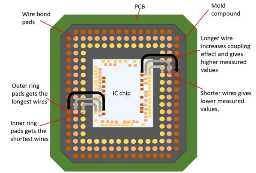 然而,随着技术的不断进步以及集成电路复杂性的日益提升,一系列更先进的封装类型应运而生,其中包括球栅阵列 (BGA),此类封装涉及多层键合线的堆叠。如下图 4 所示,由于键合线排列的复杂性显著增加,所以这种先进的方法为测量电容耦合信号带来了更多的挑战。