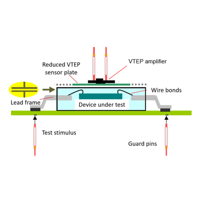 电容测试作为一种新兴的检测手段,巧妙地利用了金属表面(例如键合线与金属板,后者亦称IC上方的传感板)的耦合特性。在此配置下,IC的每一个引脚和键合线都被有效地转换为电容器的导电板。这一方法使得用户可以检测到以往采用传统 ATE 和 X 射线方法难以发现的缺陷,比如键合线和内引线之间的 “近短路”现象,以及导线的垂直下垂问题。此外,电容测试还能识别出错误的芯片和模塑化合物等潜在问题。