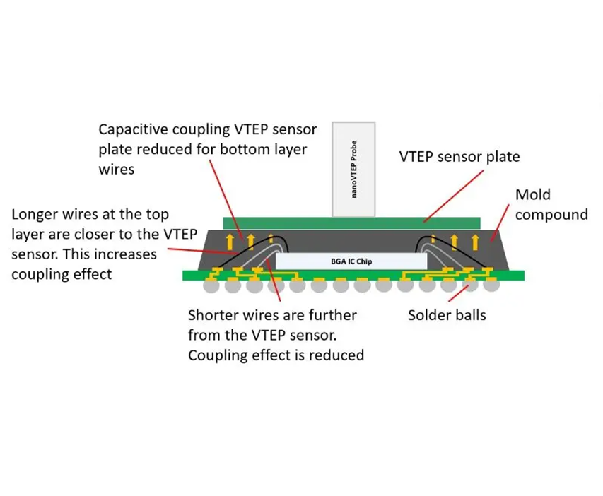 电容耦合方法可能并不适用于这些先进的集成电路封装类型。以BGA为例,其键合线焊盘是按照同心环的方式,即围绕芯片也围绕印刷电路板进行布局,由此产生了多层线路的堆叠。如图 5 所示,这种配置会影响电容耦合信号的强度和信噪比,进而使得测量电容耦合信号更具挑战性。