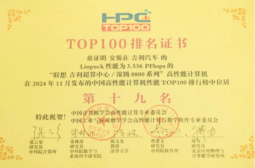 联想助力吉利汽车集团打造的吉利星睿智算中心·智能仿真平台,是目前国内已知汽车制造企业一次性建设的最大仿真科学计算集群,助力吉利汽车集团的整车设计安全模拟与计算分析,支持吉利汽车集团实现12000+次/辆的模拟安全碰撞,更快获得仿真数据,加速新车研发。同时,联想问天海神液冷方案的应用,其数据中心的PUE值达1.1062,一年满负荷运行,可减少约3179吨碳排放。值得一提的是,在联想助力打造的吉利星睿智算中心·智能仿真平台中,Linpack性能为3.536 PFlops的“联想 吉利超算中心/深腾 8800 系列”高性能计算机获得中国高性能计算机性能 TOP100排行榜第十九名,再次印证联想在算力基础设施领域的强大实力和深厚积累。