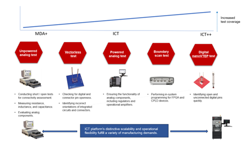 为了应对当代 PCB 生产制造过程中存在的技术和业务运营层面的障碍,ICT 系统经历了显著变革。时至今日,它们的功能相较于刚问世时有了长足发展。通过采用一系列增强方法,例如减少接入测试、集成边界扫描功能、采用 nanoVTEP 技术和嵌入式测试工具、构建并行测试能力和功能性测试能力以及采用自适应系统配置等,使得ICT系统的适用能力和实用性得到了长久的保持与提升。